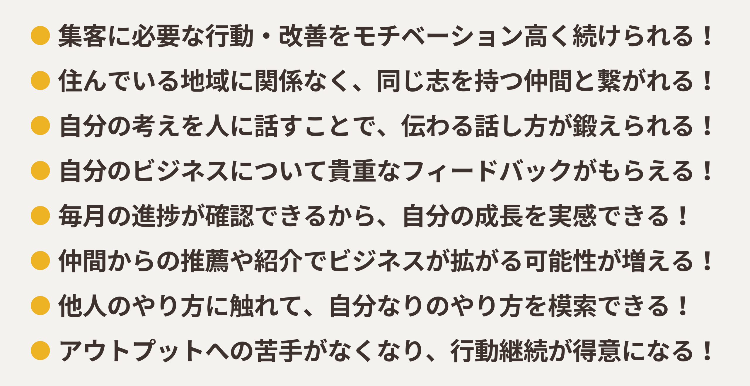 起業・副業でご自身の活動をしている30代・40代が中心です。コーチ・コンサル・占い師・デザイナーなど業種はさまざまですが、共通しているのは「自分のビジネスを軌道に乗せたい」という強いを持っていることです。